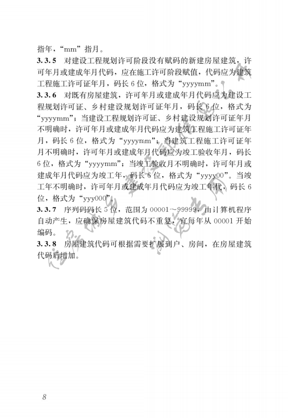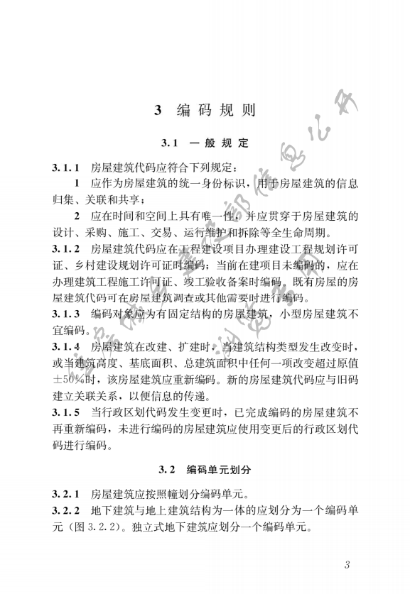 《標(biāo)準(zhǔn)》明確,房屋建筑代碼應(yīng)作為房屋建筑的統(tǒng)一身份標(biāo)識(shí),用于房屋建筑的信息歸集、關(guān)聯(lián)和共享;應(yīng)在時(shí)間和空間上具有惟一性,并應(yīng)貫穿于房屋建筑的設(shè)計(jì)、采購(gòu)、施工、交易、運(yùn)行維護(hù)和拆除等生命周期。房屋建筑代碼應(yīng)在工程建設(shè)項(xiàng)目辦理建設(shè)工程規(guī)劃許可證、鄉(xiāng)村建設(shè)規(guī)劃許可證時(shí)編碼;當(dāng)前在建項(xiàng)目未編碼的,應(yīng)在辦理建筑工程施工許可證、竣工驗(yàn)收備案時(shí)編碼。既有房屋的房屋建筑代碼可在房屋建筑調(diào)查或其他需要時(shí)進(jìn)行編碼。編碼對(duì)象應(yīng)為有固定結(jié)構(gòu)的房屋建筑,小型房屋建筑不宜編碼。房屋建筑在改建、擴(kuò)建時(shí),當(dāng)建筑結(jié)構(gòu)類型發(fā)生改變時(shí),或當(dāng)建筑高度、基底面積、總建筑面積中任何一項(xiàng)改變超過±50%時(shí),該房屋建筑應(yīng)重新編碼。新的代碼應(yīng)與舊碼建立關(guān)聯(lián)關(guān)系,以便信息的傳遞。當(dāng)行政區(qū)劃代碼發(fā)生變更時(shí),已完成編碼的房屋建筑不再重新編碼,未進(jìn)行編碼的應(yīng)使用變更后的行政區(qū)劃代碼進(jìn)行編碼。