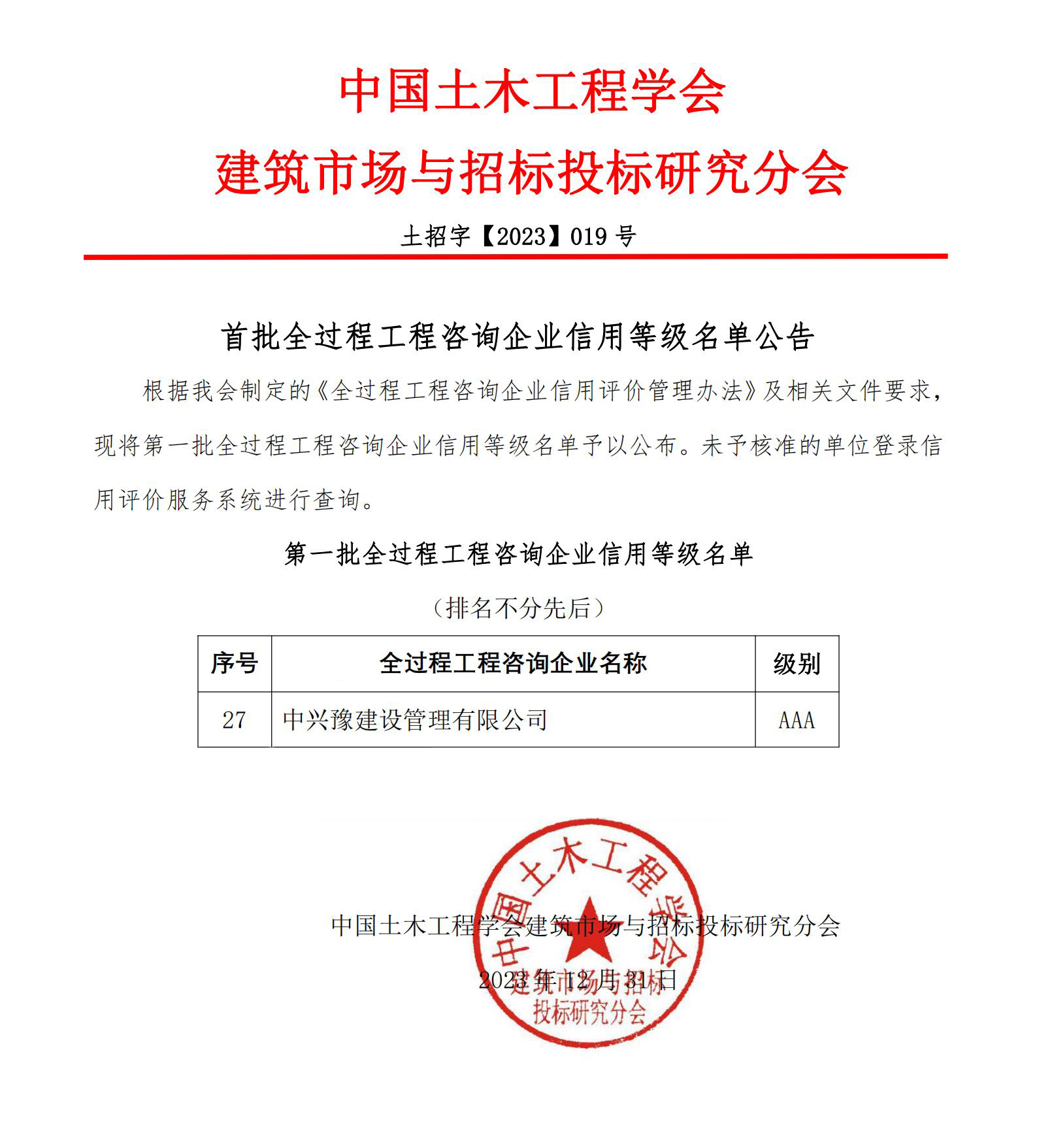 近日,中興豫建設(shè)管理有限公司獲評中國土木工程學(xué)會建筑市場與招標(biāo)投標(biāo)研究分會“首批全過程工程咨詢企業(yè)信用等級評價AAA企業(yè)”,成為河南省內(nèi)唯一首批獲得該信用評價等級的全過程工程咨詢企業(yè)。
