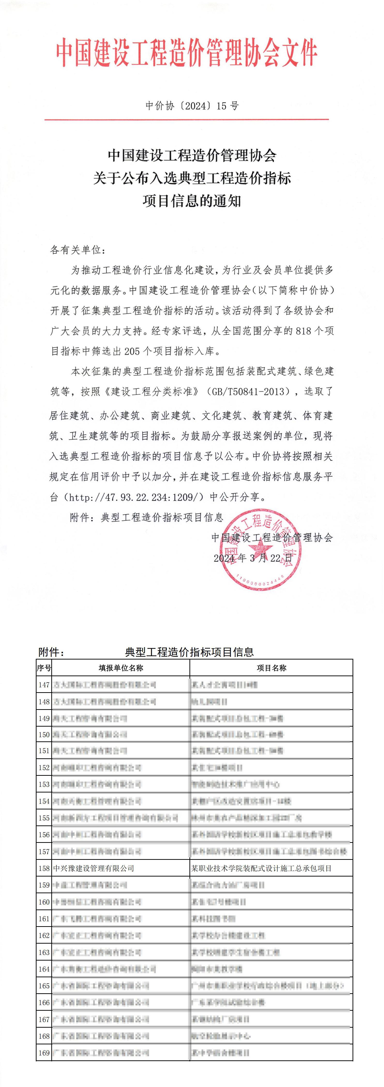 近日,中國建設工程造價管理協(xié)會關于公布入選典型工程造價指標項目信息的通知中,我公司的“某職業(yè)技術(shù)學院裝配式設計施工總承包項目"作為典型項目入選其中。