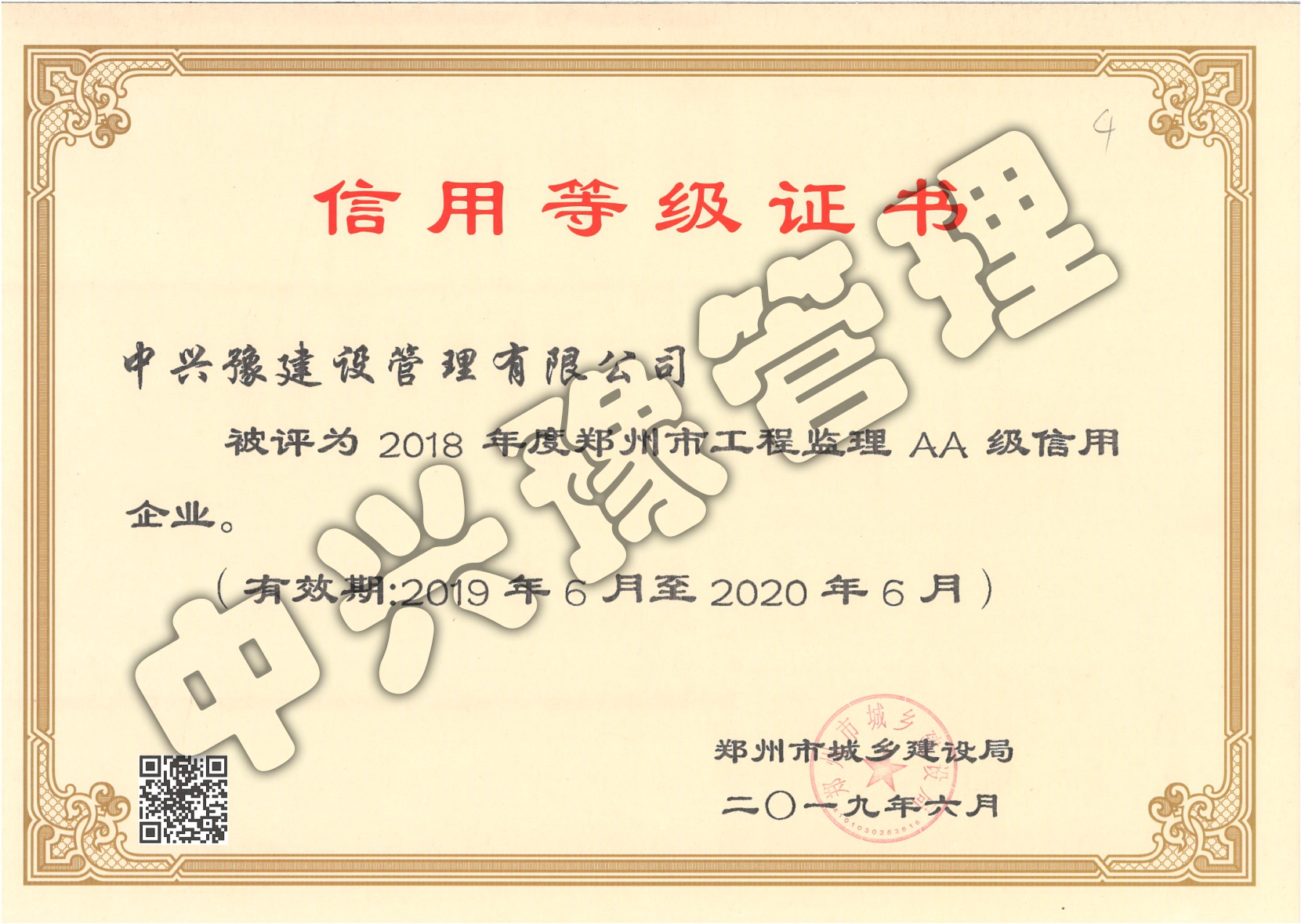 2018年度鄭州市工程監(jiān)理AA級信用企業(yè)-公司榮譽