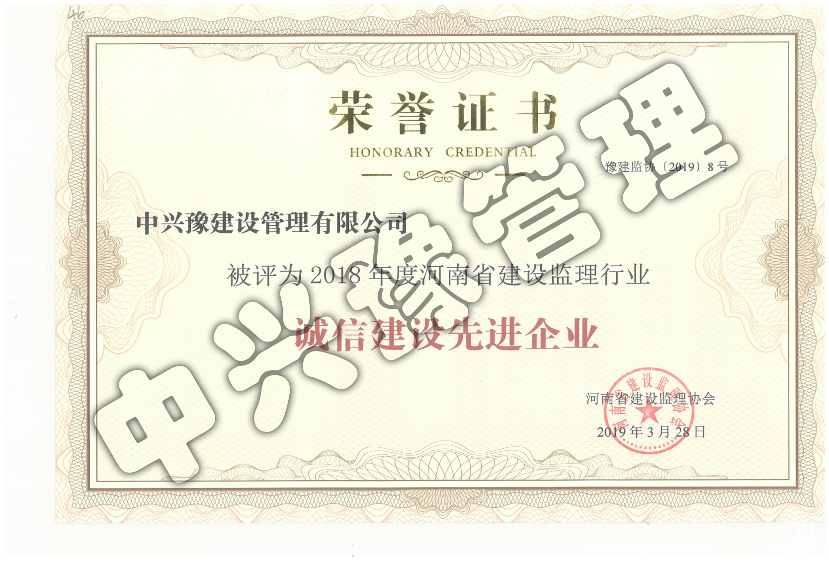 2018年度河南省建設(shè)監(jiān)理行業(yè)誠信建設(shè)先進企業(yè)企業(yè)-公司榮譽