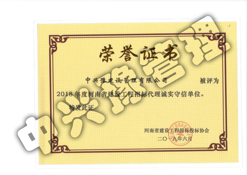 2018年度河南省建設工程招標代理誠實守信單位-公司榮譽