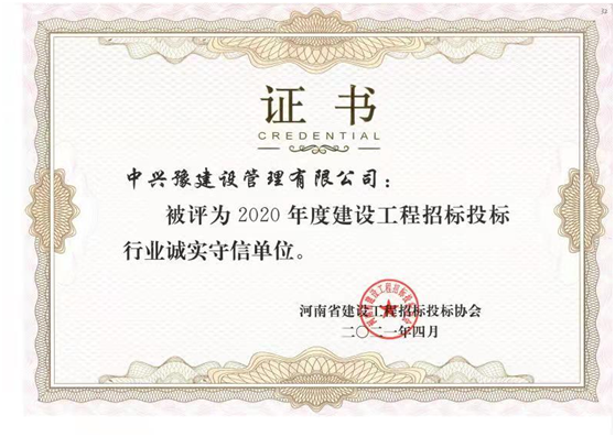人無信不立,業(yè)無信不興。該榮譽的獲得,激勵著中興豫建設管理有限公司在未來經(jīng)營活動中一如既往堅持誠信理念,營造誠信環(huán)境。公司將充分發(fā)揮誠實守信單位示范引領作用,積極履行誠實經(jīng)營、守信服務的社會責任,為招投標行業(yè)健康有序發(fā)展貢獻力量。