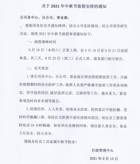 關(guān)于2021年中秋節(jié)放假安排的通知